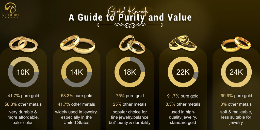 Higher karat gold, such as 24K, has a rich yellow color but is softer and less durable. Lower karat gold, like 14K or 10K, contains more alloy metals, making it more durable and available in a variety of colors, including white and rose gold.