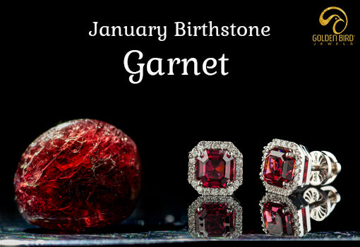 [Image showcasing the January birthstone Garnet. A rough garnet gemstone is displayed next to a pair of garnet earrings with diamond accents. The text January Birthstone Garnet is prominently displayed above the stones] - [Golden Bird Jewels]