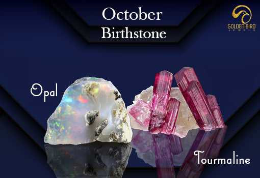 [mage showing October birthstones a colorful Opal on the left and vibrant pink Tourmaline crystals on the right with the text October Birthstone]-[golden bird jewels]