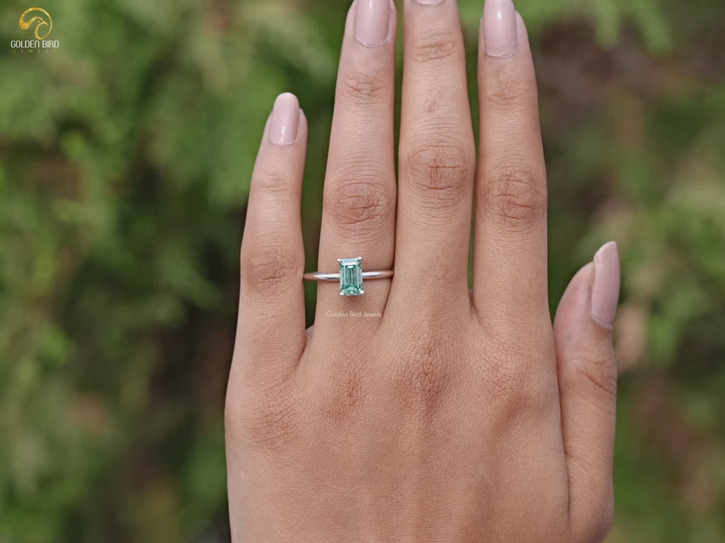 In finger front view of Green Emerald Cut Moissanite engagement ring